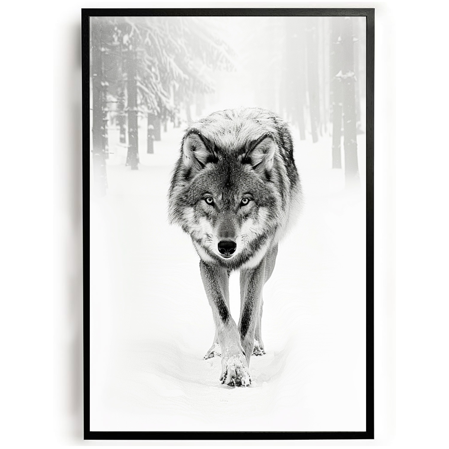 Eigenschappen en formaten Poster wolf in besneeuwd bos