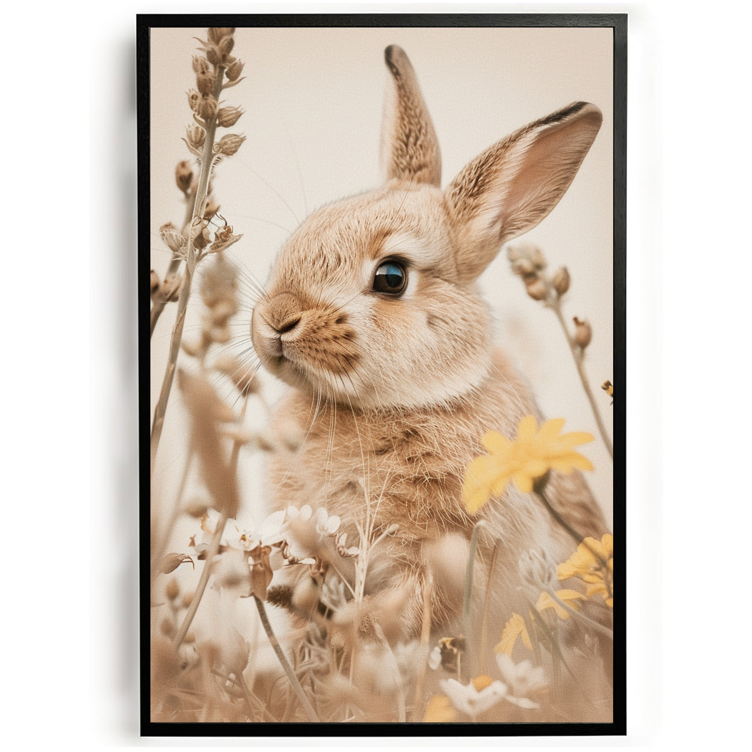 Ben je op zoek naar een schattige poster voor in de woonkamer, slaapkamer of op kantoor? Onze “Poster konijntje tussen de bloemen” is precies wat je nodig hebt!